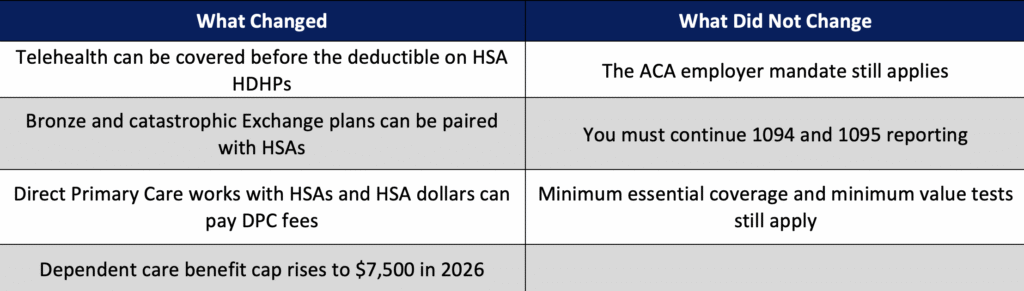 | 2026 Employer To-Dos • Set 2026 contributions using the 9.96% affordability threshold • Refresh plan documents and SPDs for permanent telehealth relief • Decide whether to add or promote HSAs and DPC offerings • Amend your Section 125 plan for the $7,500 dependent care limit and update enrollment materials • Recheck ICHRA strategy in states where employees buy Bronze plans • Confirm your ACA reporting vendor timeline and data feeds. The One Big Beautiful Bill Act brings meaningful changes to how employers design, fund, and communicate health and welfare benefits. While some provisions create opportunities for more flexibility and tax efficiency, others require careful compliance adjustments. Taking proactive steps now will ensure your organization remains compliant, competitive, and ready to leverage the advantages these changes bring in 2026 and beyond. |